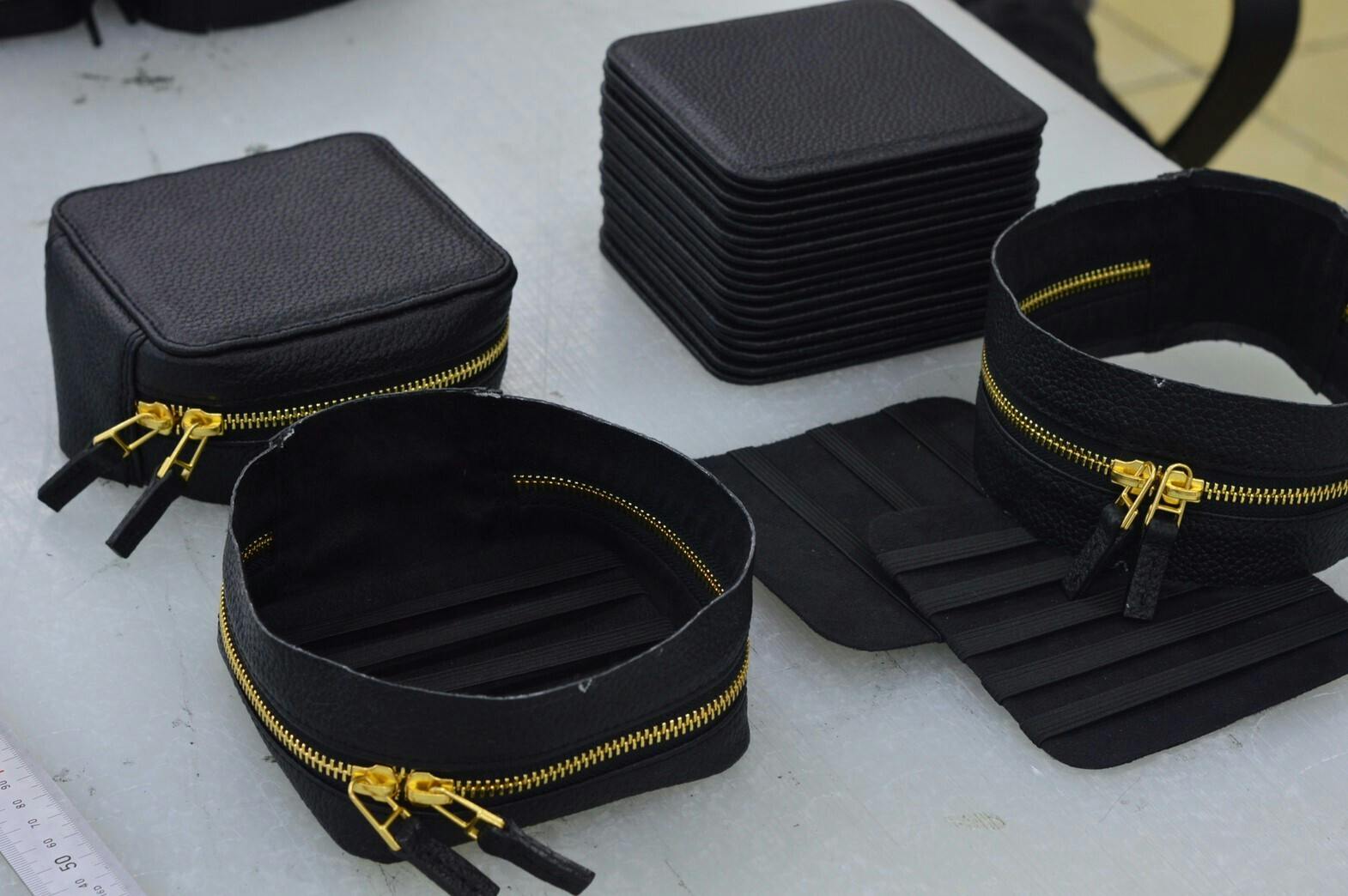 誰にでも、どんなものでも違和感なくマッチするようにブラックに仕上げています。ファスナーはYKK製のゴールドカラーのエバーブライトという製品を使用しています。