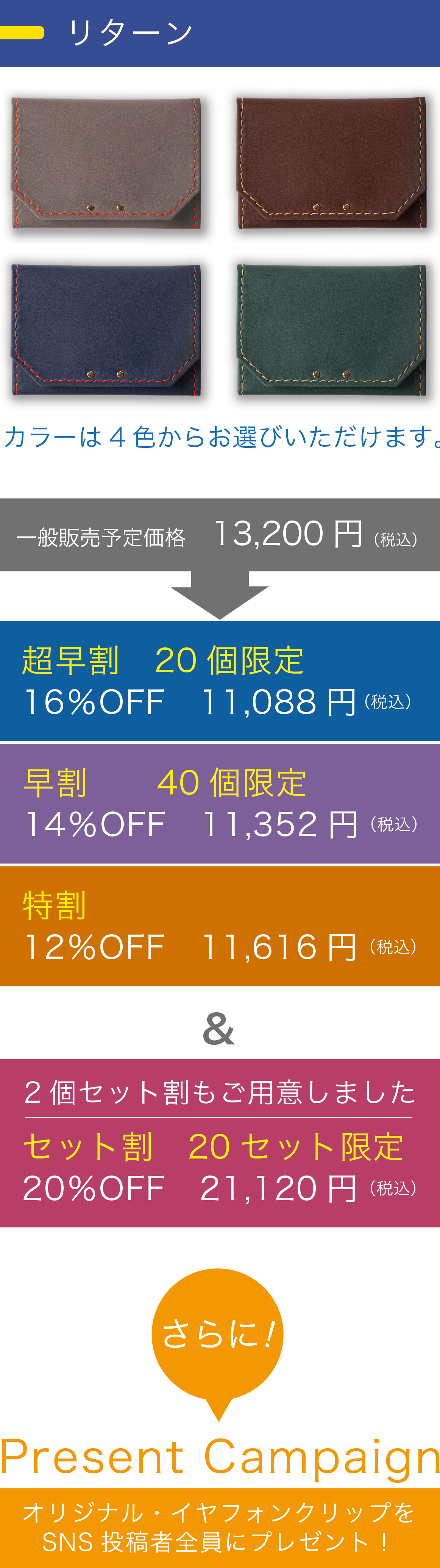 ※ リターン価格とは別にcampfire(machi-ya)のシステム利用料として1支援毎に200円(税別)が支援者様の負担となります。尚、このシステム利用料はcampfireが受け取るもので、当社が受領するものではございません。