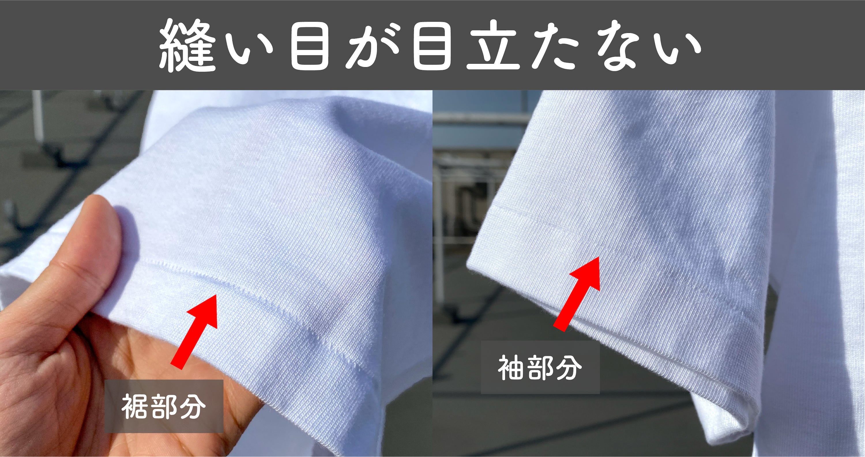今回のHiKEI Tシャツは、袖や裾の縫い目が目立ちません!これは『天地引き』という仕様で縫製が目立ちません!表面に点状の縫い目が表れるだけで、目立ちにくいのです。