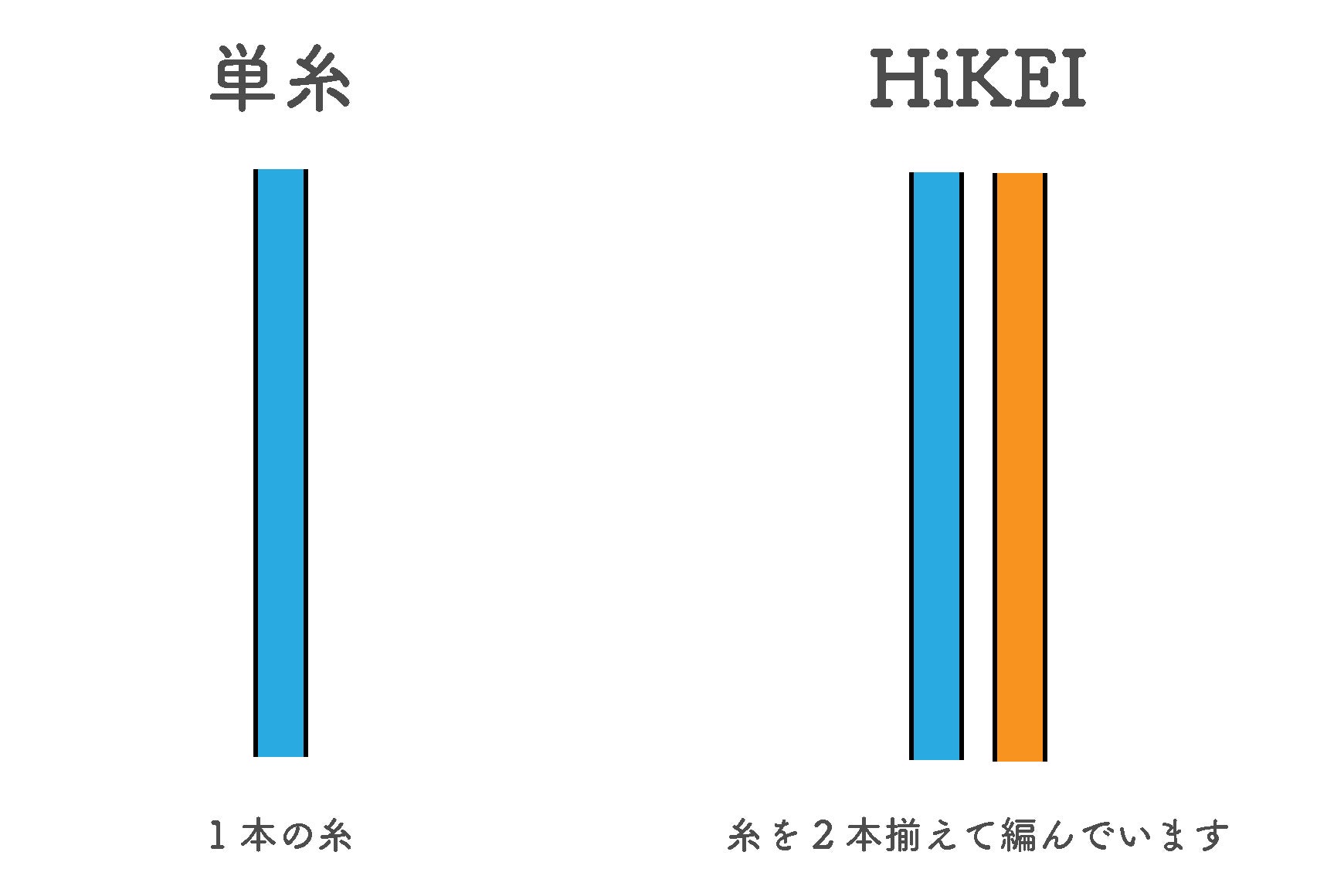 今回のHiKEI Tシャツの生地は、「二本取り引き揃え」といって、2本の糸を揃えて編んで生地にしています。1本の糸(単糸)でも編むことができる生地に2倍の量の糸使用し、贅沢に編んでいます。