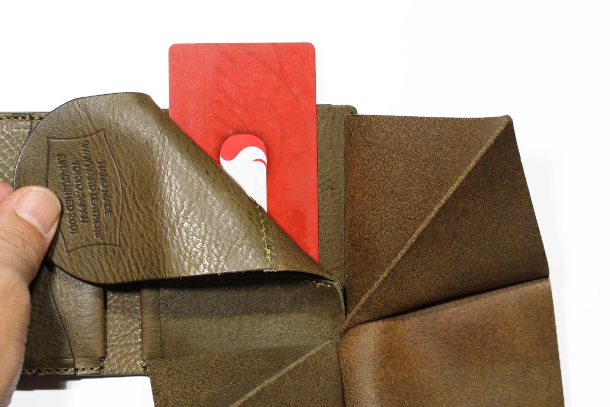 「TANAGOKORO」はファスナー、ボタン類の金具を一切使っていません。これにより、まるで紙のような薄さを実現しました。パタンと折り畳んでポケットに入れて持ち運べば、小銭が落ちることはありません。