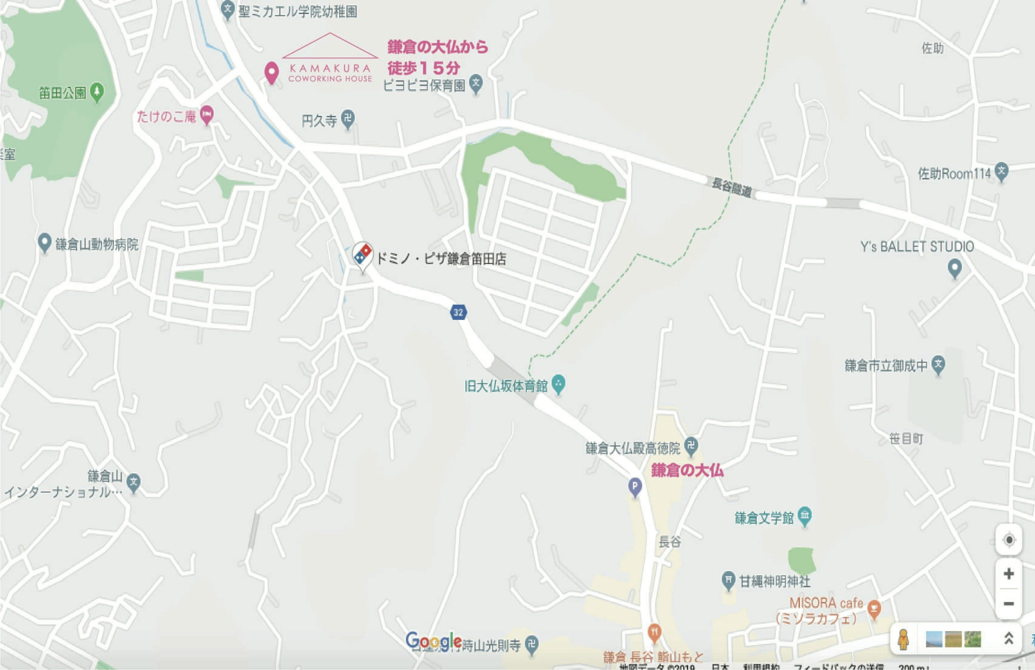 △KAMAKURA COWORKING HOUSE / 場所は鎌倉市常盤。閑静な住宅街の一角。最寄りのバス停から徒歩2分で敷地内に駐車場完備。最寄りの駅は鎌倉駅で、藤沢駅・大船駅からもアクセス可能。