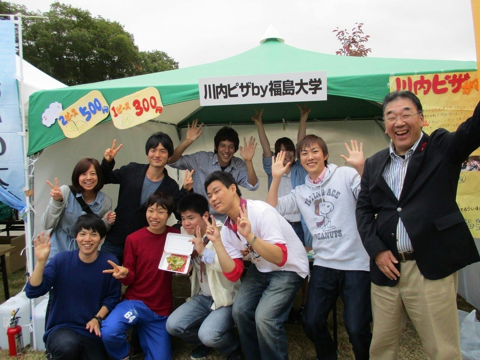 当時グループで開発したのは、川内村産のイワナ、野菜、そば粉をたっぷりと使用した「川内ピザ」です。これを、村内のイベントや大学祭にて販売しました。