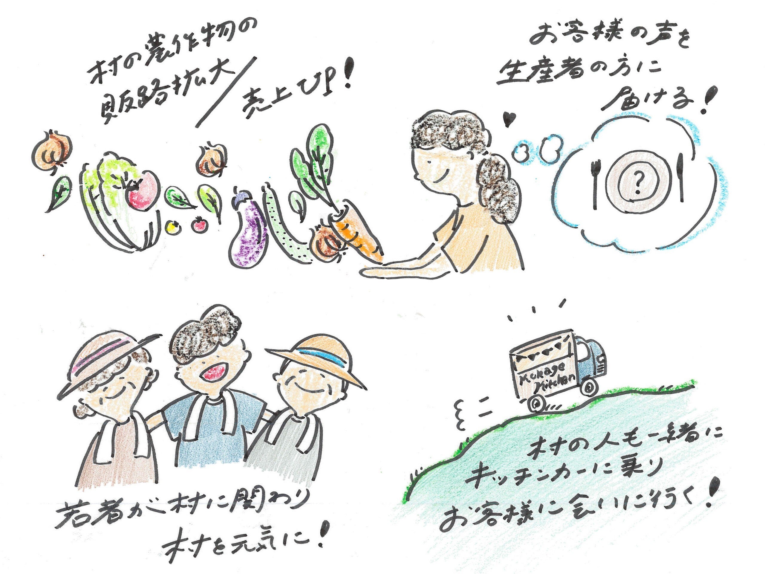 といっても、「幸せ」の形は人それぞれ。Kokage Kitchen はいくつかの方向から、村の人たちの幸せにアプローチしていきたいと思っています。