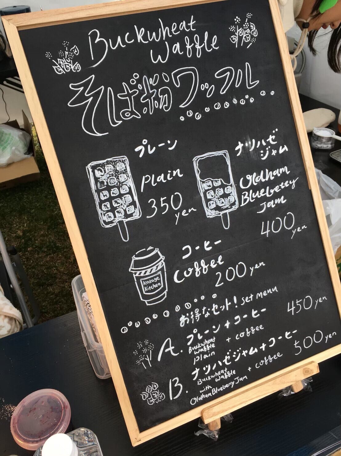 (看板メニュー「そば粉ワッフルのナツハゼジャムトッピング」)