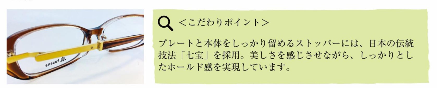 また、プレートとテンプル部分をしっかり留めるストッパーには日本の伝統技法「七宝」を採用。