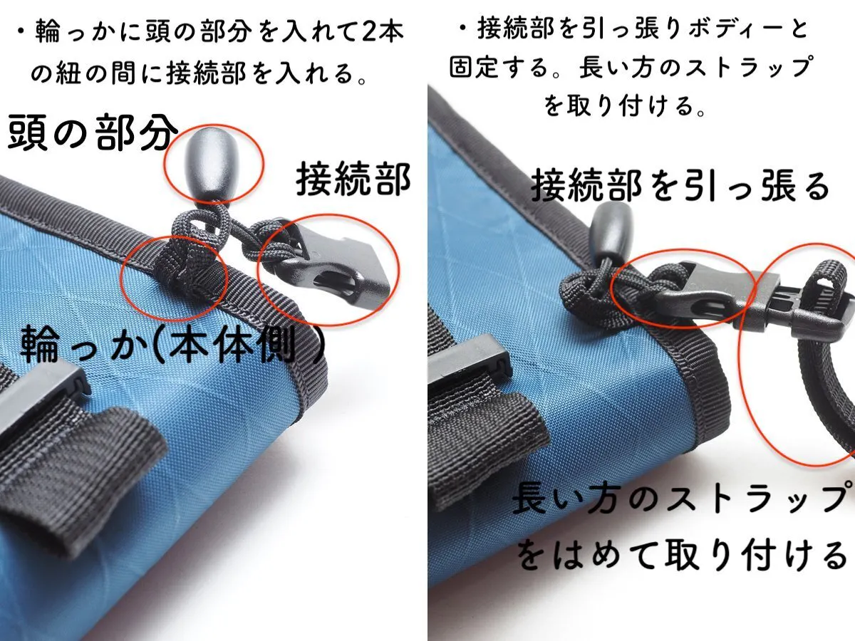 ・バッグ本体の輪っかに紐の頭の部分を入れて、2本の紐の間に 接続部を入れて、固くなるまで引っ張ります。