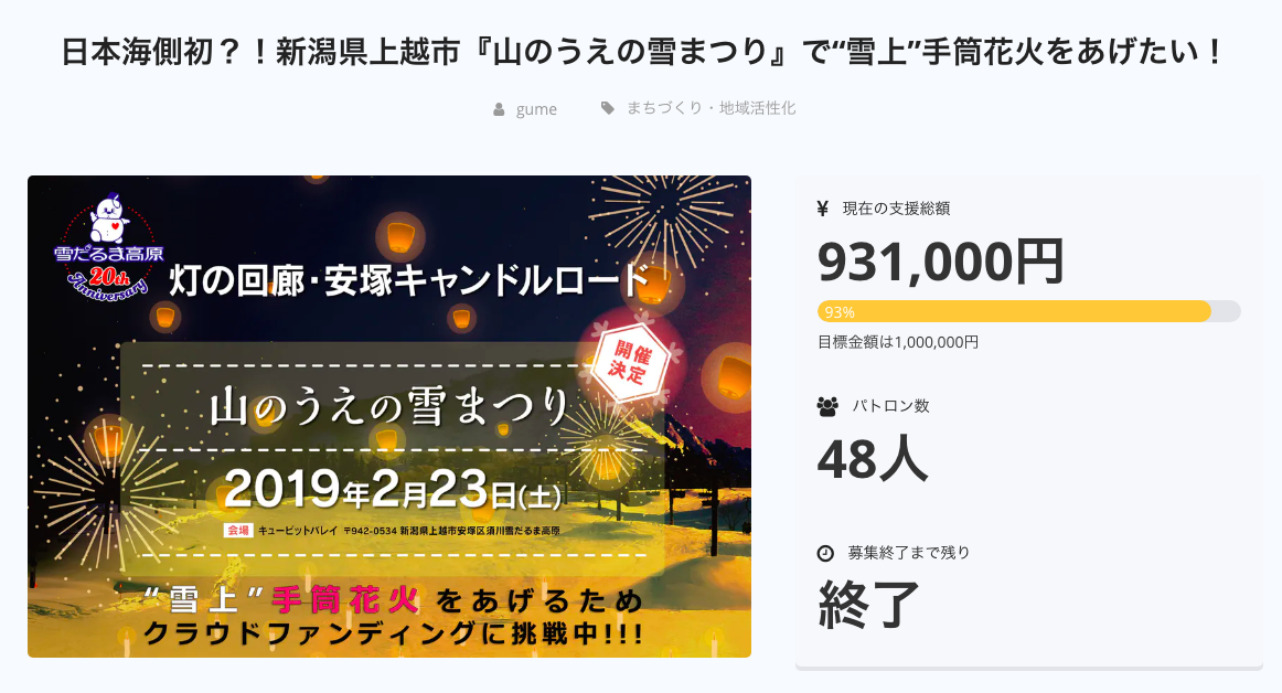 2019年2月23日(土)に開催された『山のうえの雪まつり』を盛り上げるべく、クラウドファンディングのプロジェクトを立ち上げました。