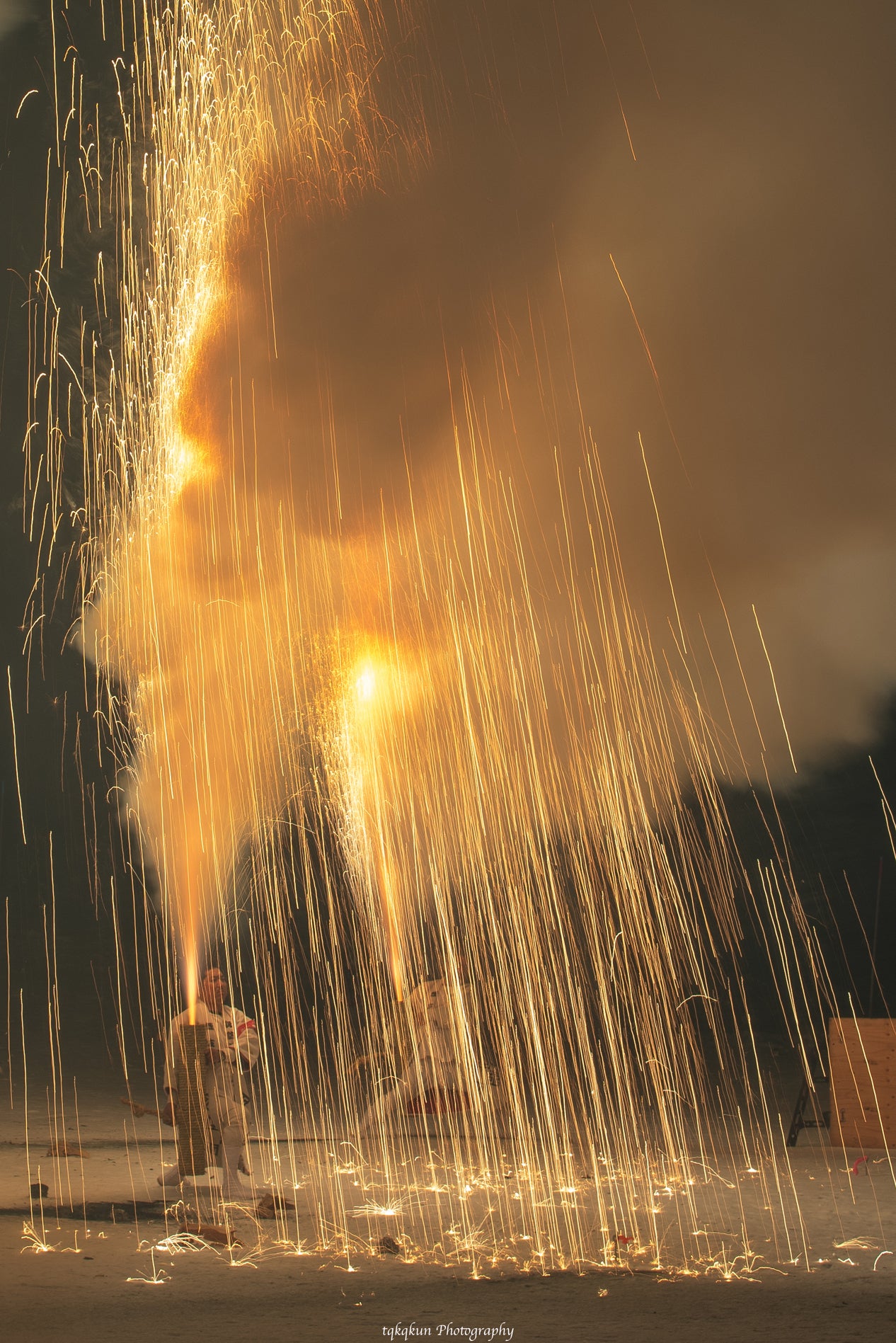 手筒花火の種類は火薬の量によって分けられていて、斤(きん)という単位で呼ぶそうですが、手で持ったり抱えたりしてあげるものは一番小さいもので4分の1斤、続いて半斤、1斤、2斤・・・と順番に、5斤までの大きさがあります。今年あげたものは最大で3斤でした。火薬の量は1.8キロ…!