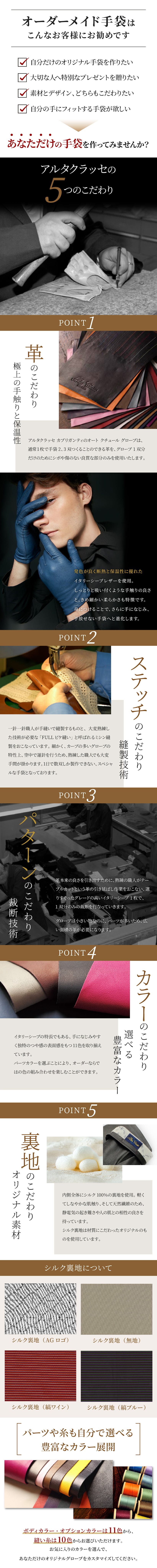 今までは既成のプレタポルテと制限のあるドライビング手袋のみネット販売してきましたが、通常モデルの5本指オーダーメイド手袋をお買い上げいただいたファンのお客様から、「ドライビング手袋も、この5本指の様にマチや掌側の色、パイピングの色を自由に選べないか?」とのお問い合わせを数多くいただいたのがきっかけです。