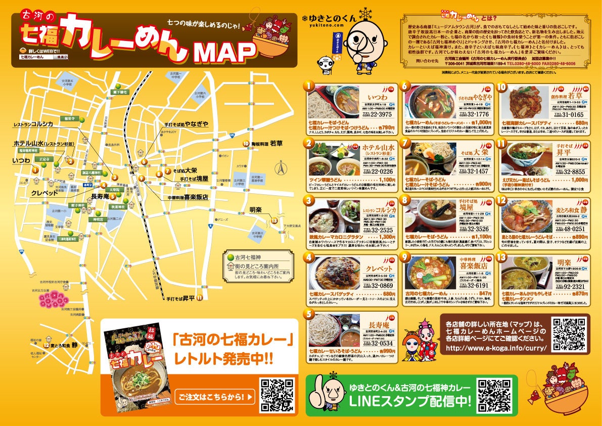 ともに街おこしの一環である「古河七福神めぐり」と「古河のカレーめん」をドッキングさせ、『古河の七福カレーめん』として事業を推進していくこととなりました。七福神にちなみ、メニューは七種類の具材を加えることを共通のルールとし、地元産のものを盛り込むことを推奨しています。