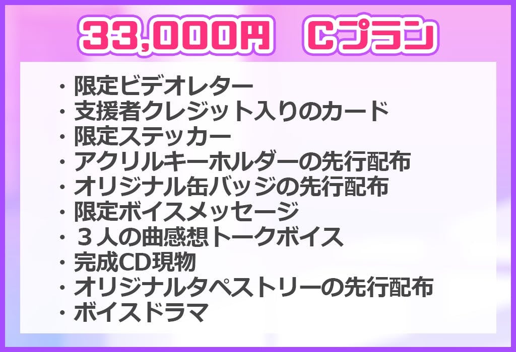 ストレッチゴールの内容は、「300万円を達成した場合」に「Bプラン(11000円)」以上のコース(Bプラン含む)をご支援頂いた方全員を2021年5月(予定)に開催の「お披露目オンラインライブ」にご招待致します!このオンラインライブはこのクラウドファンディングで完成した楽曲をお披露目させて頂くオンラインライブとなります!(開催日の詳細は後日発表させて頂きます。)