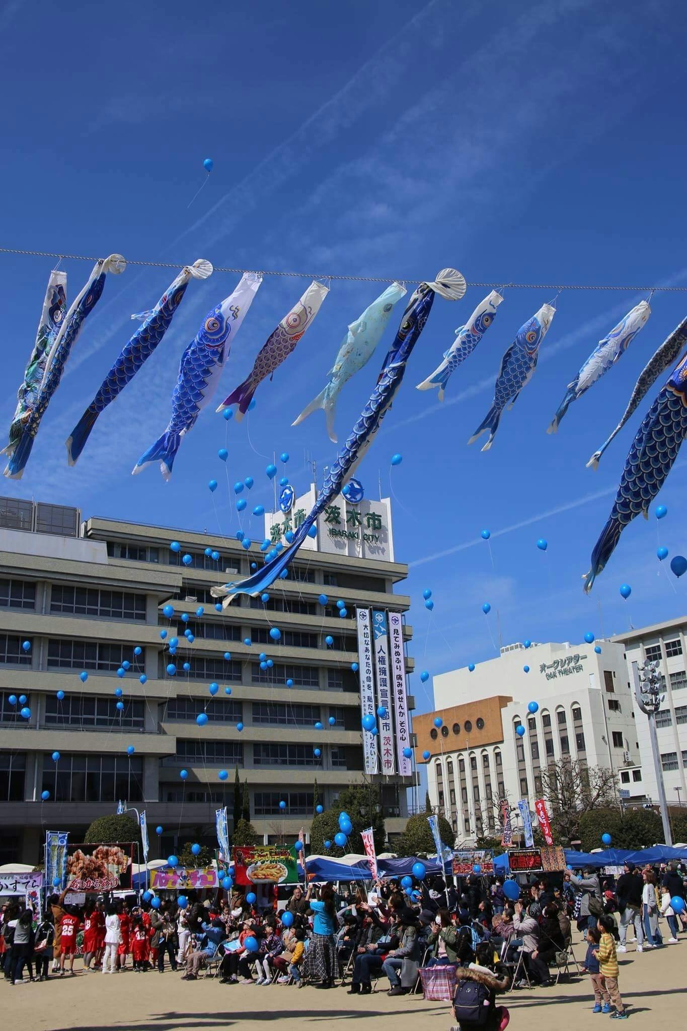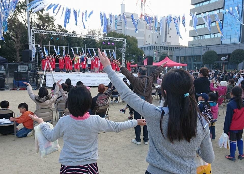 ・宮城県の「青い鯉のぼり」プロジェクトから約300匹の青い鯉のぼりをお借りし、大阪のグランドで空高く掲げる。