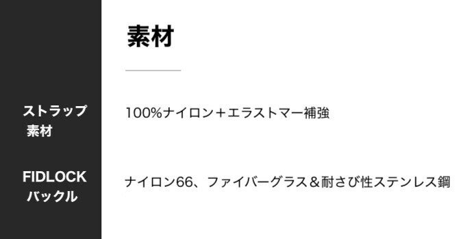 Fidlock社製のバックルは、ナイロン66、グラスファイバー、防さびステンレス鋼で構成されています。