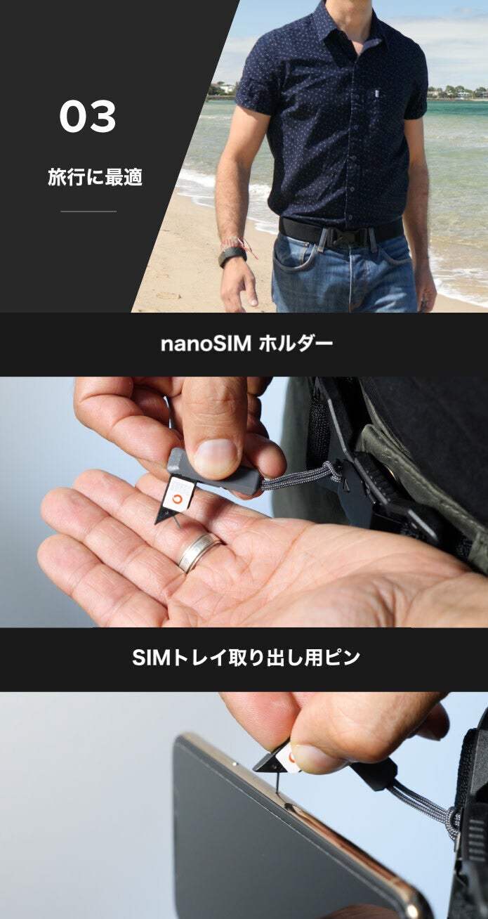 ステルスベルトにはSIMトレイ取り出し用ピンが付属しているため、もう二度と困ることはありません。 プルタブ内にSIMカードを収納することもできます。