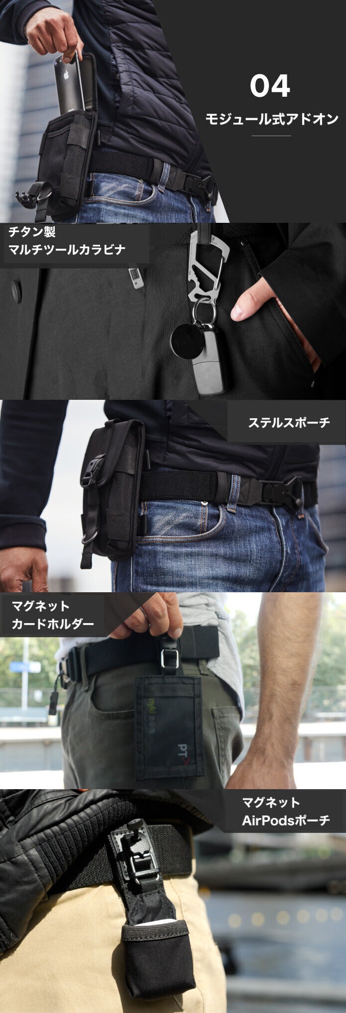 豊富なアドオン:ステルスポーチ、カラビナ、カードホルダーなど、旅行に便利なアドオンを追加できます。