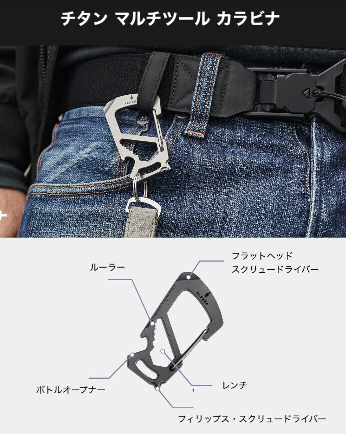 チタンマルチツールカラビナは、ボトルオープナー、スクリュードライバー、カッターなどのマルチ機能な備えています。