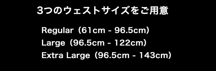 ウエストサイズは3種類から選択可能: Regular: 61cm - 96.5cm、Large: 96.5cm - 122cm、Extra Large: 96.5cm - 143cm