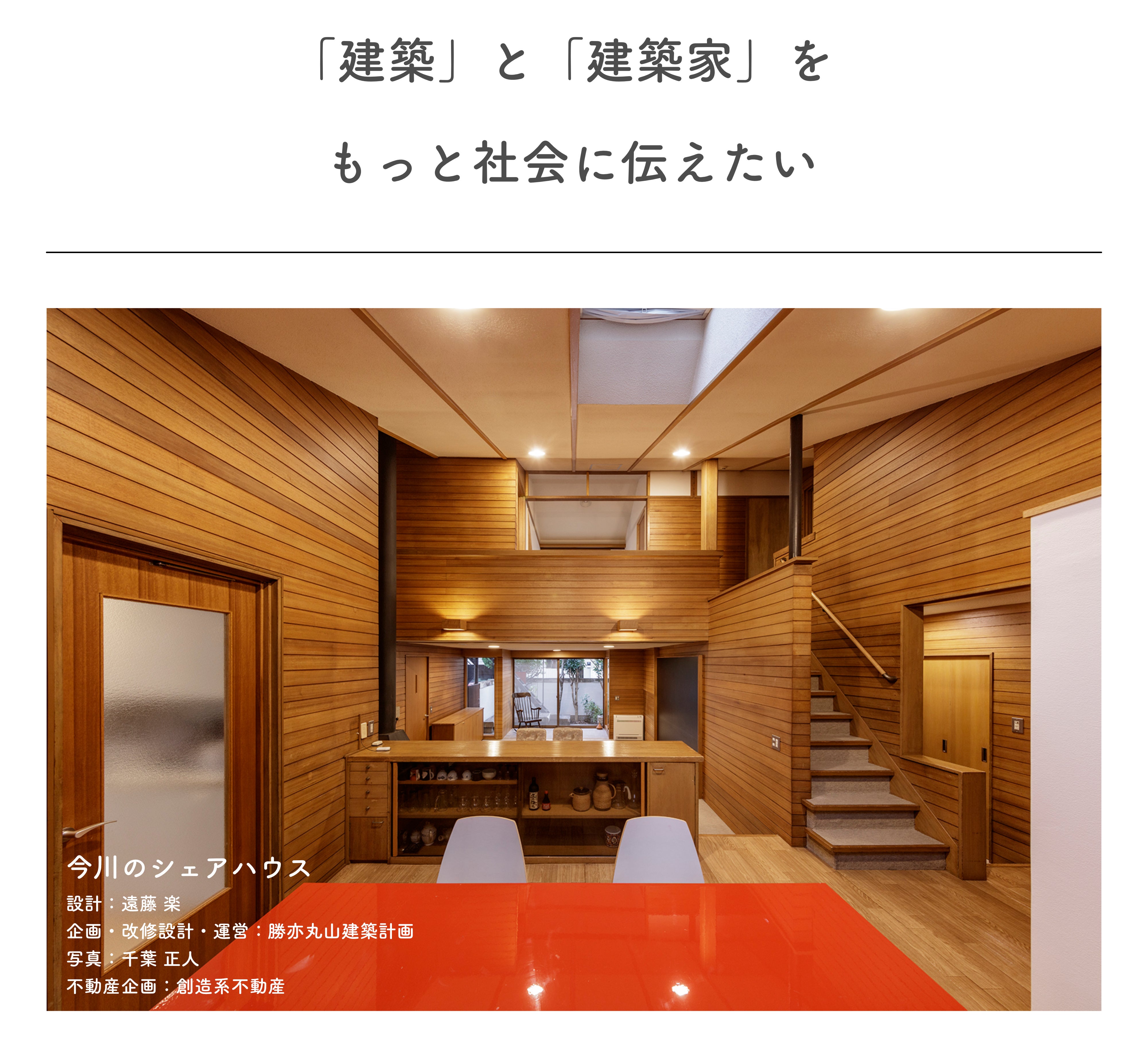 また二次流通の市場を整えることで、「建築家の設計する建築を建てることの意味」を高めることを目指しています。