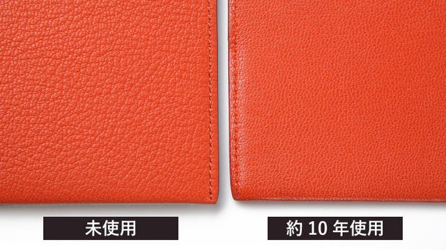 牛革に比べると薄く柔らかいため、型崩れなどを起こしにくいのが特徴です。実際、上の写真のように、10年使っても型崩れや色あせを起こすこと無く、むしろ手に馴染む財布に進化していきます。