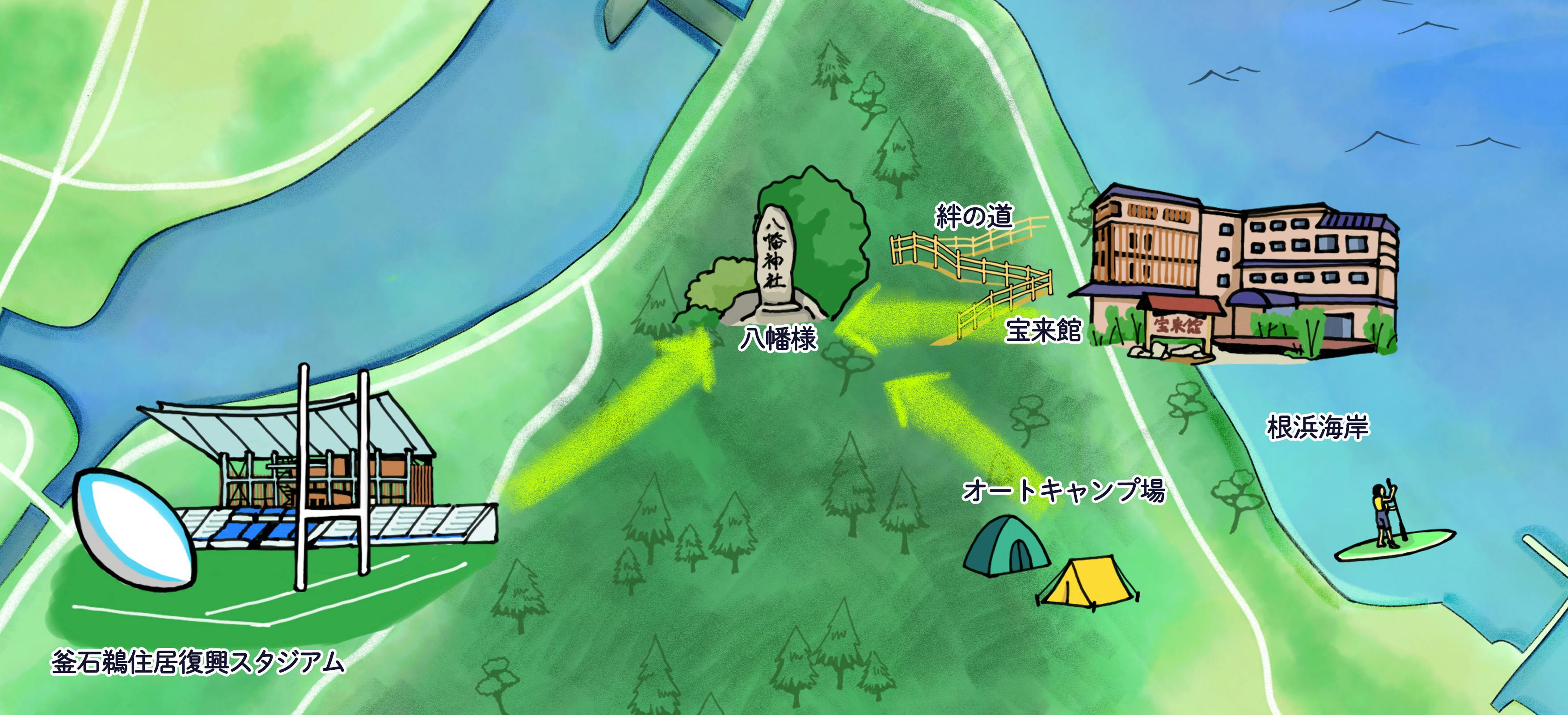 2015年には日本でのラグビーワールドカップ開催の会場のひとつに釜石が選ばれました。根浜からすぐの釜石市立鵜住居小学校・釜石東中学校の跡地に「釜石鵜住居復興スタジアム」が建設されることになり、その晴れの舞台に向けて根浜のレジャー施設の復旧も進み、オートキャンプ場やレストハウスが完成、その隣にはワールドカップ出場選手も練習するサブグラウンドも整備されました。