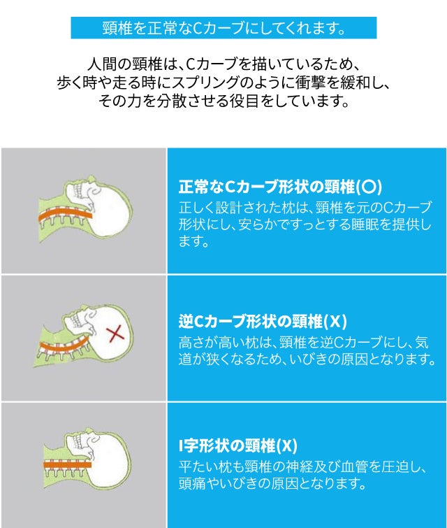 ジェントルリーマピローは、人間の本来の頸椎の骨格であるCカーブに合わせて作られたため、使い初めからフィットし、寝心地が良い方は頸椎が正常だということです。逆に、枕を使ったところ、どこか不自然で合わない感じがすれば、それは枕がおかしいのではなく、自分自身の頸椎が変形している可能性があります。