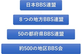 全国に約500の地区BBS会、50の都府県BBS連盟、8の地方BBS連盟から構成され、約4,500名程度の会員からなる組織です。