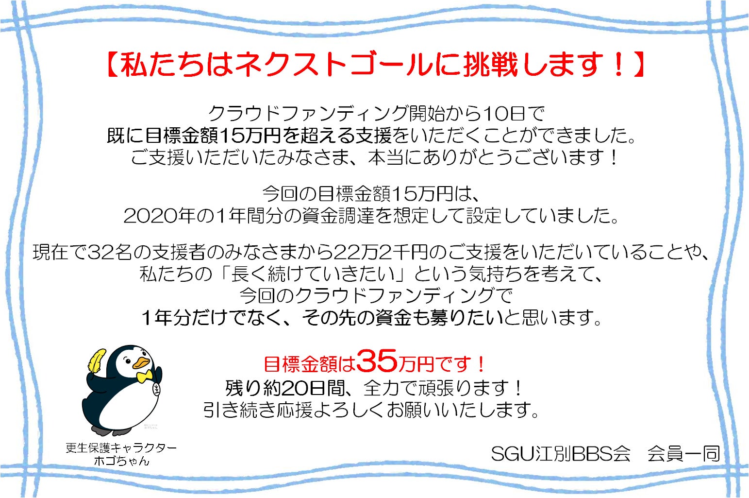 2020/02/19 11:31SGU江別BBS会です!!皆様のおかげで、51名の方から397,000円と多くのご支援をいただくことができました。ご支援・拡散のご協力・応援メッセージ等ありがとうございました!!集めた資金は、来年度からの2年間分の資金となります。就業支援センターの少年たちが更生をし、より良いスタートを切れるようSGU江別BBS会でサポートしていきます。活動状況等はTwitter・Facebookの2つで更新していきますので、チェックしてみてください。引き続き、沼田町プロジェクト及び私たちSGU江別BBS会の応援よろしくお願いいたします!Twitter→ https://twitter.com/sgubbskaiFacebook→ https://www.facebook.com/sguebetsubbs/?tn-str=k*F もっと見る【ご協力・ご支援のお願い】ネクストゴールに挑戦します!