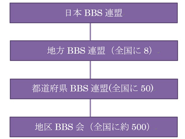 BBSの組織には、日本BBS連盟、地方BBS連盟、都道府県BBS連盟、地区BBS会の4つがあり、それぞれが連携して活動を行っています。