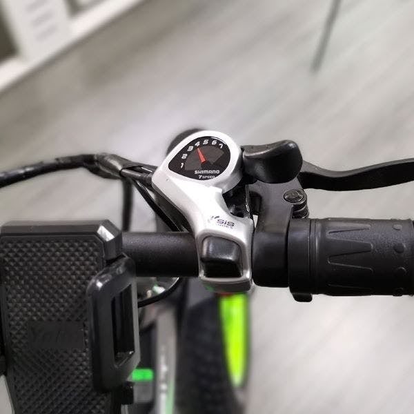 A:シマノ式変速機を使用しています。止まった状態で無理に変速機を動かすと故障の原因になりますので、ペダルを漕ぎながらの変速をお願いします。