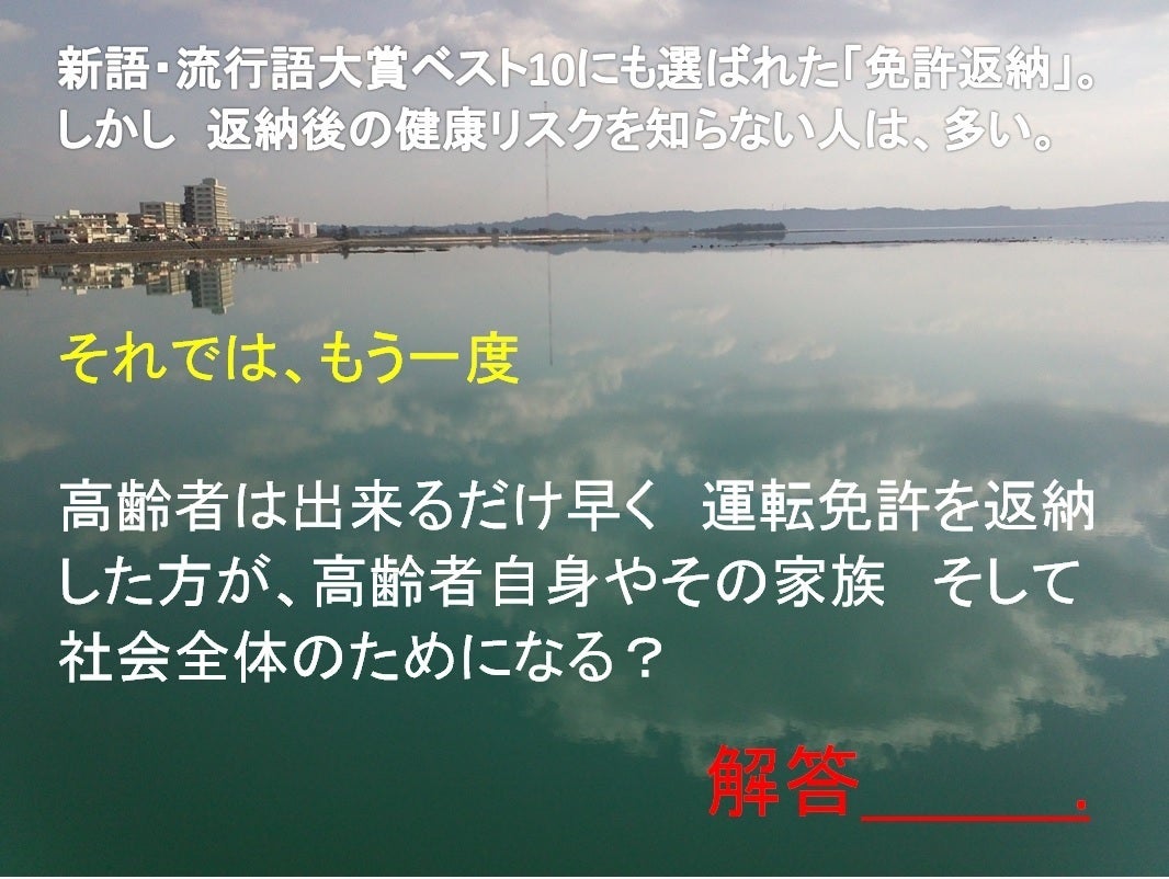 「運転寿命」は、公道の「運転を休む」ことで、免許を返納するのではない。教習所を活用した認知症 要介護リスクを軽減させる自動車運転健康法を 私は、全国の自動車教習所へと提案したいと思います。メリットとして まず 教習車の稼働時間を増やせる。繁忙期の2月 3月 7月 8月以外で。通年で教習車の稼働が期待できる。次に 運転免許保持者が、運転するので助手席に指導員が乗る必要がない。同じ教習車の稼働時間でも指導員の人件費がいらない分 売り上げだけではなく 利益率が上がる。and MORE
