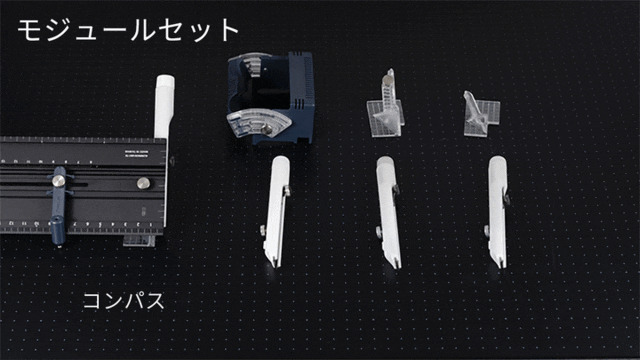 断面の角度が自由に設定できるモジュールや、片手で円形が切り取れるモジュールを含めた4種のモジュールと特製カッター、スケールをセットにしました。