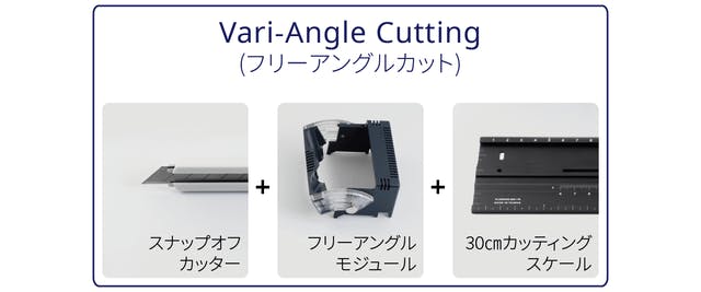 VA-01 フリーアングルモジュールは、0~45度の範囲で角度を5度刻みから設定可能。切り込みの深さも自由に調節できます。RU-302 30㎝カッティングスケールと併せて使用すれば、一般のカッターでは難しい角度付きカットも、ガタつきのないシャープで精確な断面に仕上げられます。