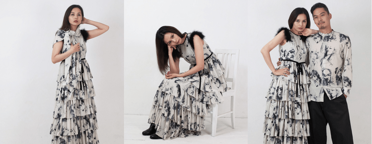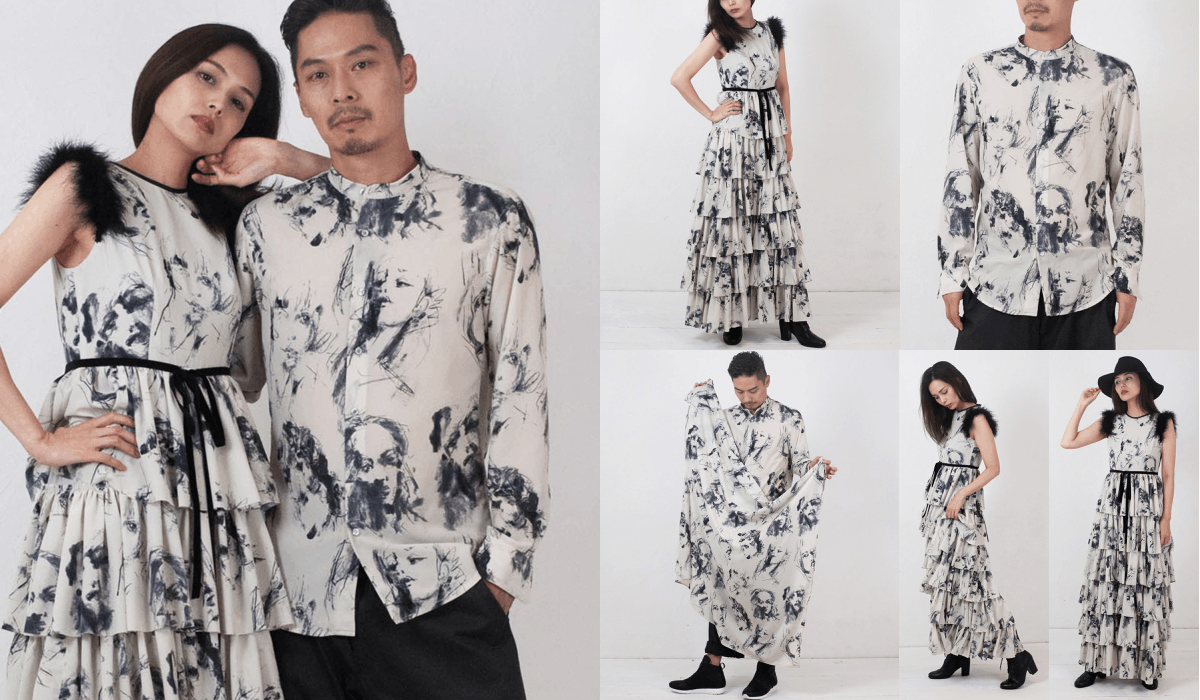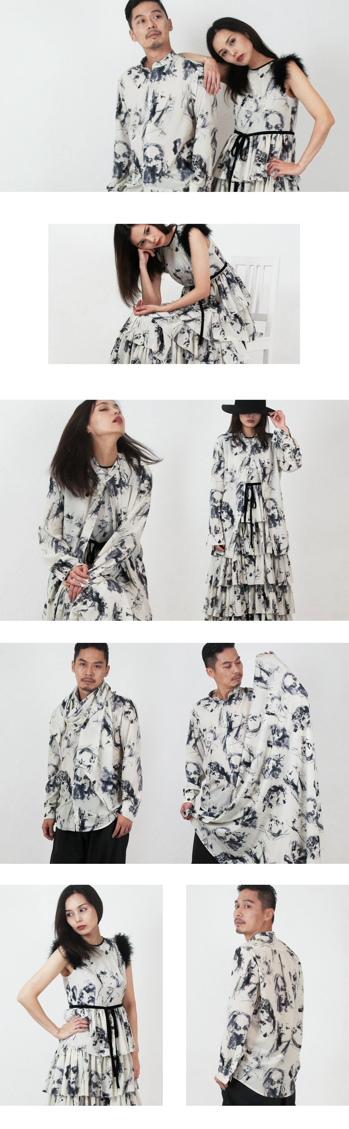 ワンピースドレス・ドレスシャツ・スカーフは今回のために、プリント生地からオリジナルで制作しました。