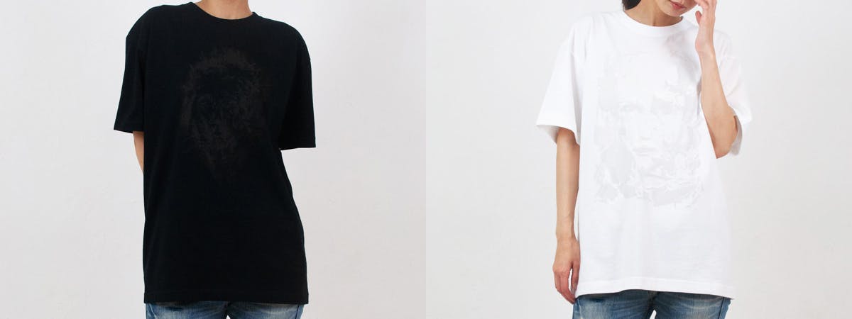 黒い生地に黒いインク / 白い生地に白のインクを乗せているTシャツ。