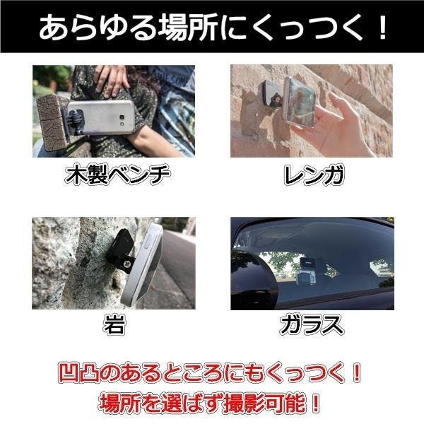 (注)※どこにでも付くと記載がございますが長時間継続して接着するわけではございませんので短時間的なマウントでの使用を前提として頂き、湿潤面では接着性能が著しく低下致しますので予めご理解ご了承の程、お願い致します。推奨重量~140g。