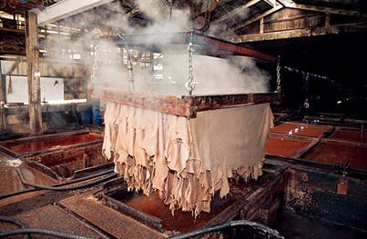 有害な物質を一切使わず、天然のチェスナット(栗)、オーク(ナラ)、ミモザ(アカシア)などのワットルバーグ(樹皮)から抽出された樹液のタンニン(渋)の槽に1枚1枚を漬け込ませます。