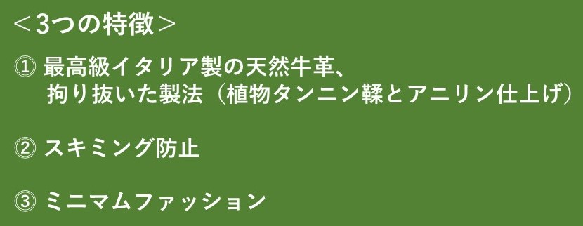 スキミング防止機能付きでコンパクト、スキミング防止機能付きで天然革、そこから企画開発が始まっています。