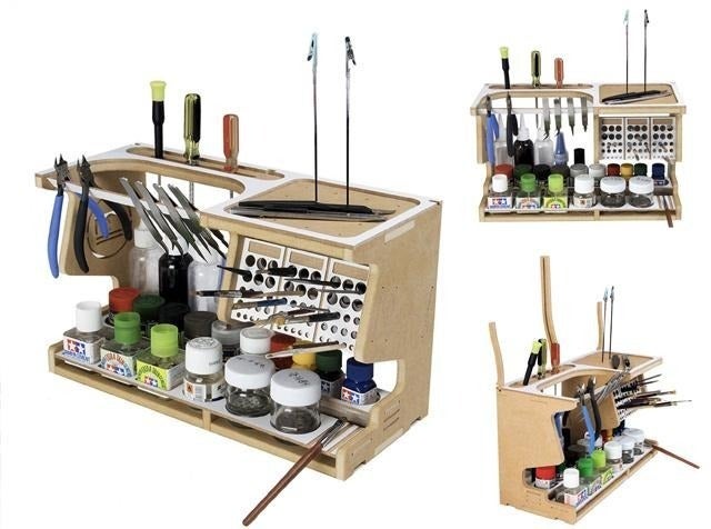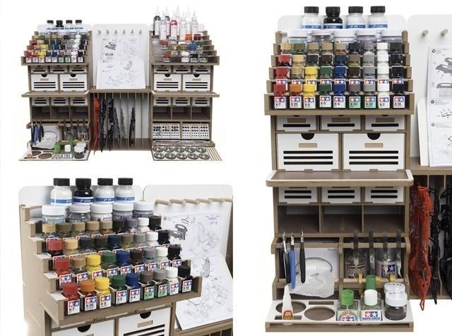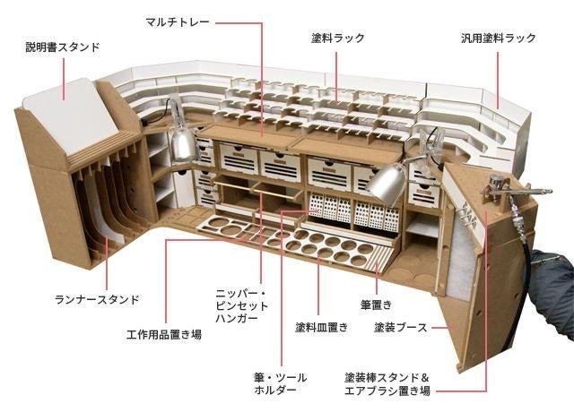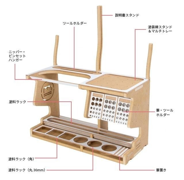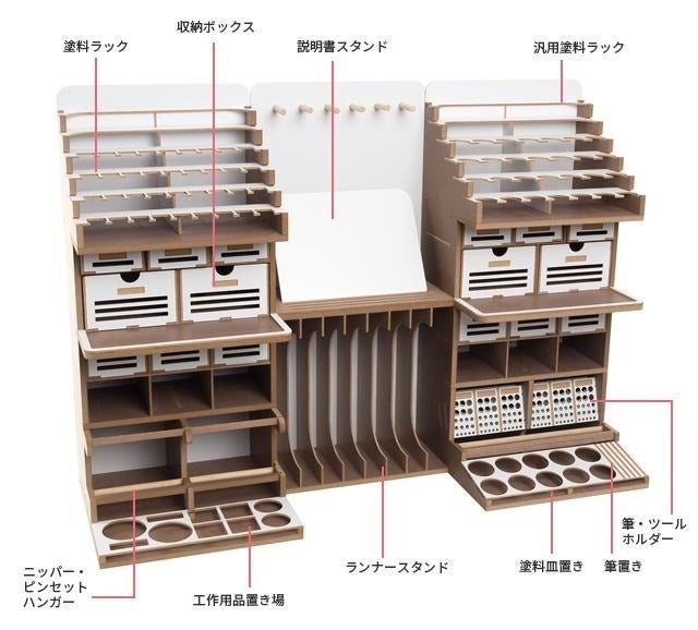 ニッパー・ピンセットハンガー、ランナースタンド、説明書スタンド、塗料ラック、収納ボックスなど、プラモデル製作に必要な収納スペースが一通りそろうセットです。