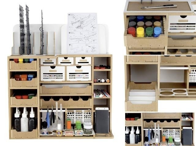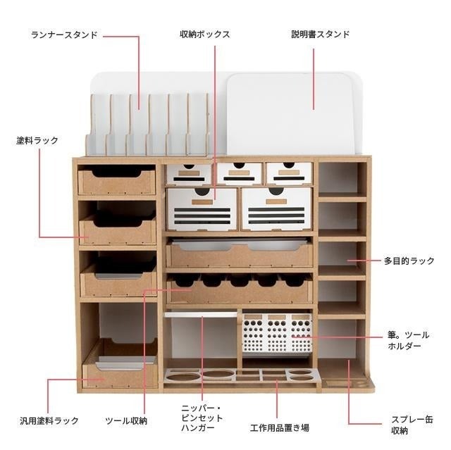 自由度が高く効率的なモジュール式収納システムは、プラモデル製作に集中できる環境を作り出し、すべてのモデラ―に快適な作業空間を提供します。