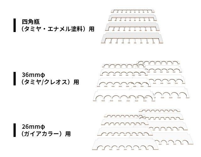 塗料ラックには各メーカーの容器に合わせてそれぞれ専用のパーツが付属しています。