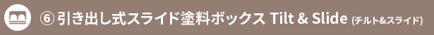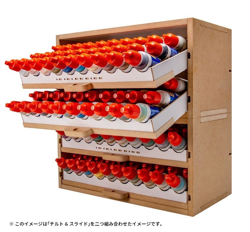 「チルト&スライド」は、引き出し式スライド塗料ボックスです。幅30cm × 高さ15cm × 奥行き15cmという小さなサイズにたくさんの塗料ボトルが収納可能。棚が傾斜し塗料を抜き出しやすく設計されたアイデア引き出しです。
