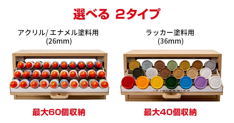アクリル&エナメル塗料用ではなんと60個、ラッカー塗料用は40個の塗料ボトルを収納できます。