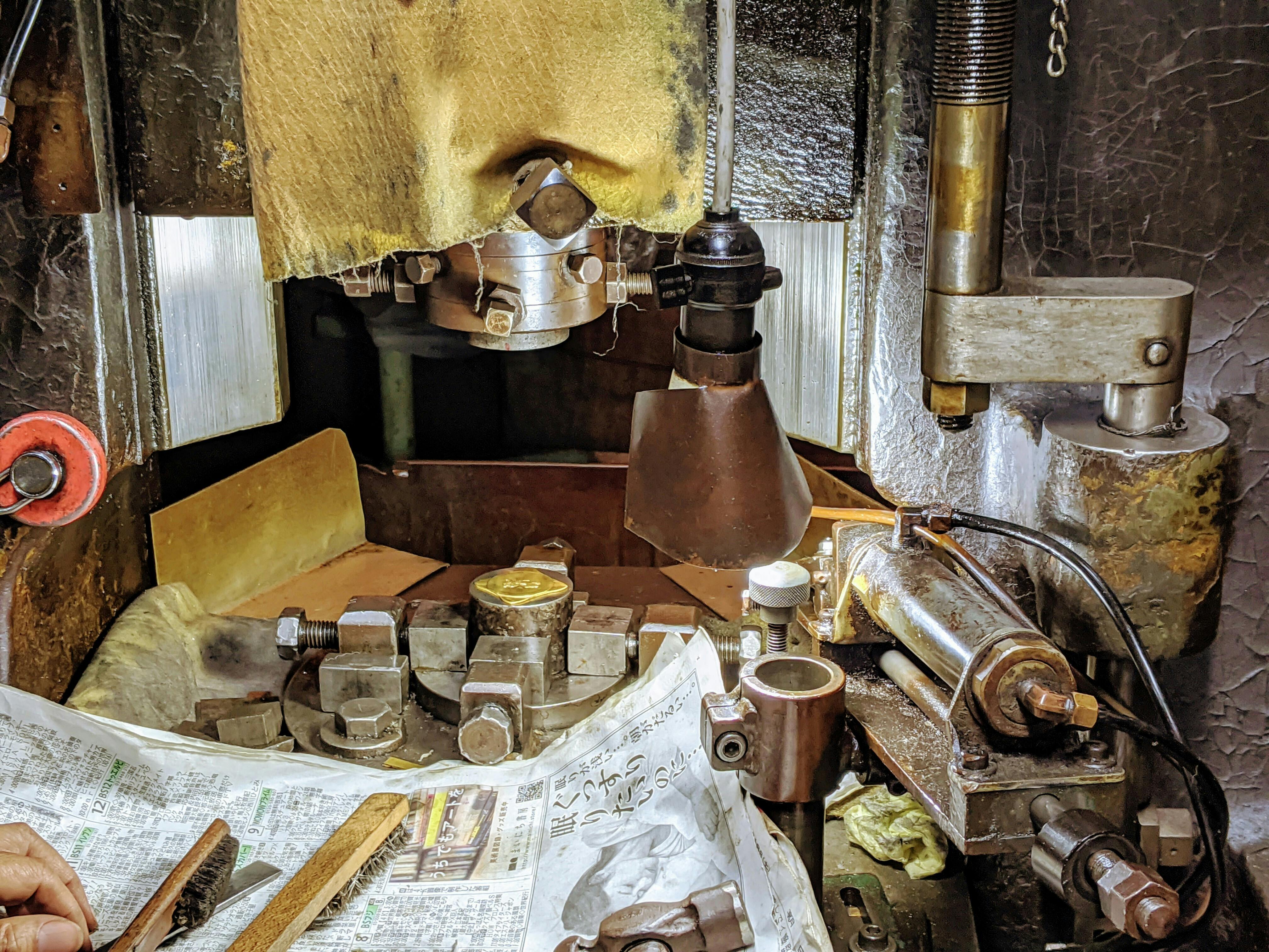 鋼の型の上に地金を置きプレス機で50t〜100tの圧力をかけてプレスする事で地金に型の模様が反転されます。