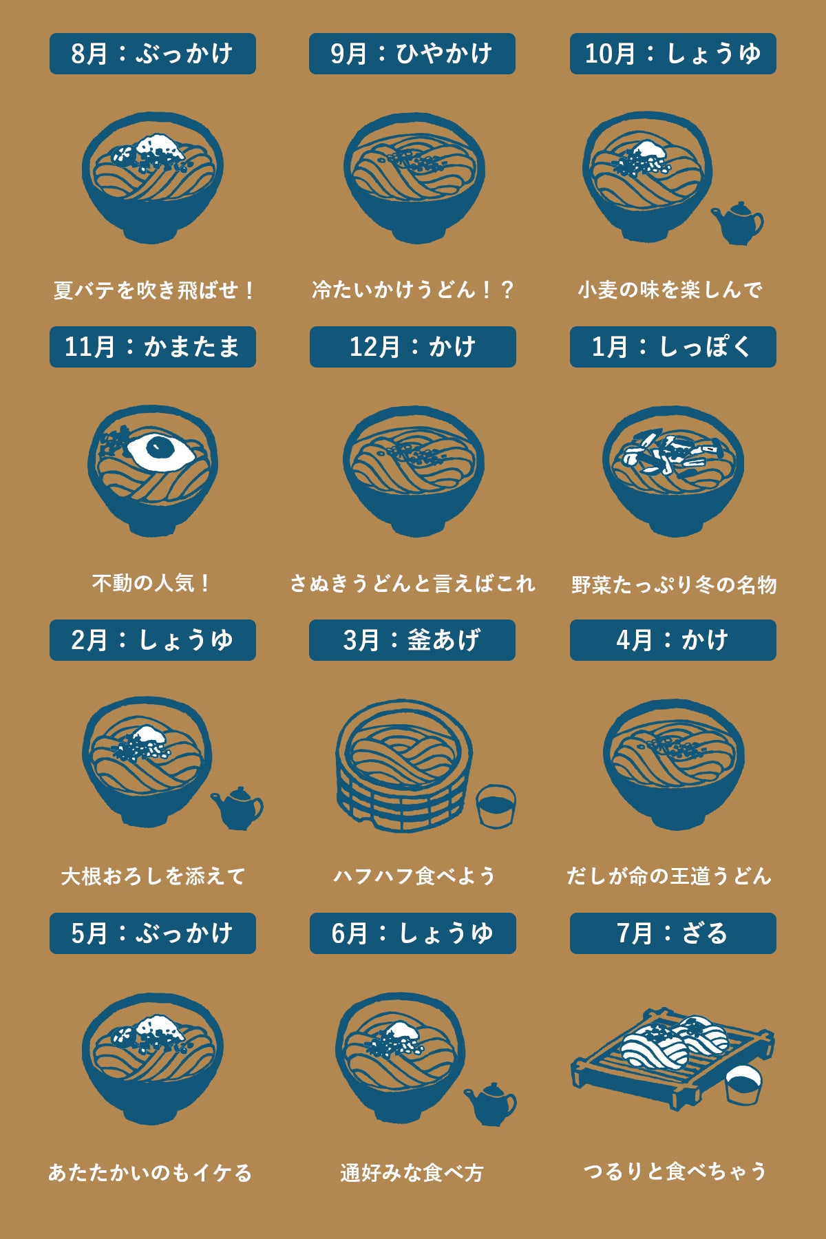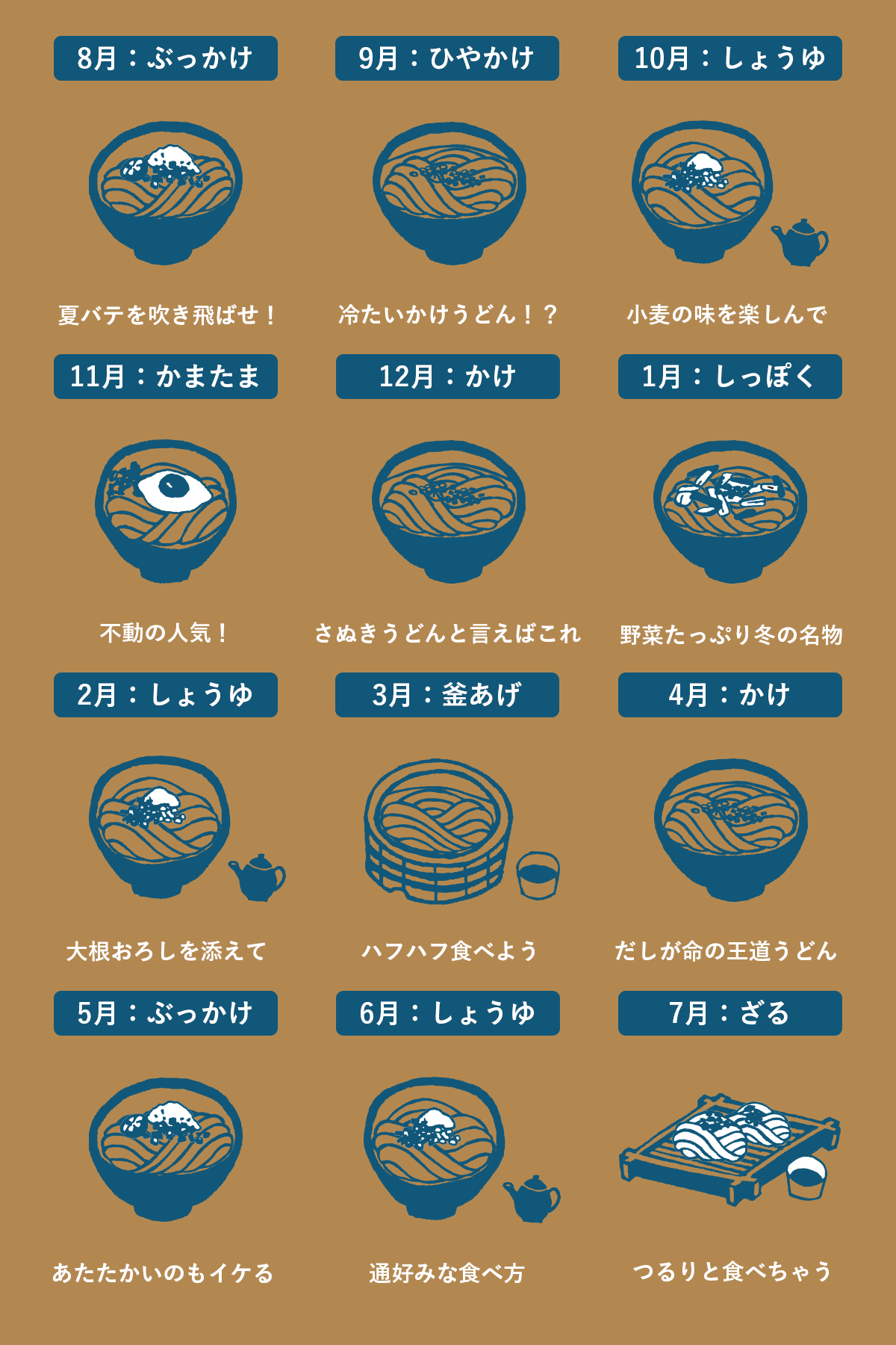 『うどんのおうち』を6ヶ月楽しんでいただくと、讃岐うどんのメニューがバッチリ身に付く内容になっています。これでうどん屋さんへ並んでも地元民と同じように注文ができますよ。