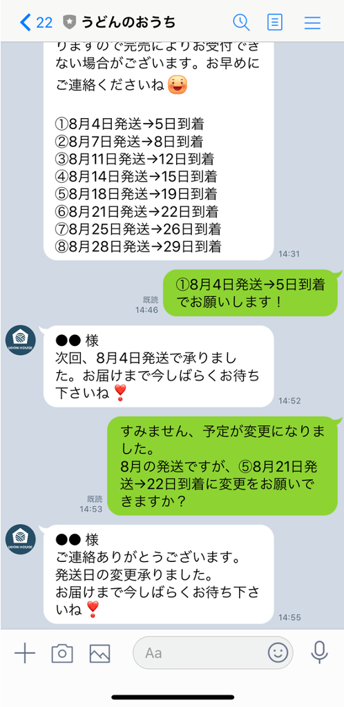 UDON HOUSEの宿泊営業も夏から再開する予定なので、製麺ができるのは今のところ週に2日。1日に作れる量は30名様まで。火曜日と金曜日に麺を作るので、みなさまのライフスタイルに合わせてご希望の発送日を選択してください。週と曜日は毎月変更してもOK、毎月第二金曜日と固定してもOK。やりとりはLINEで気軽に行っていただけます。