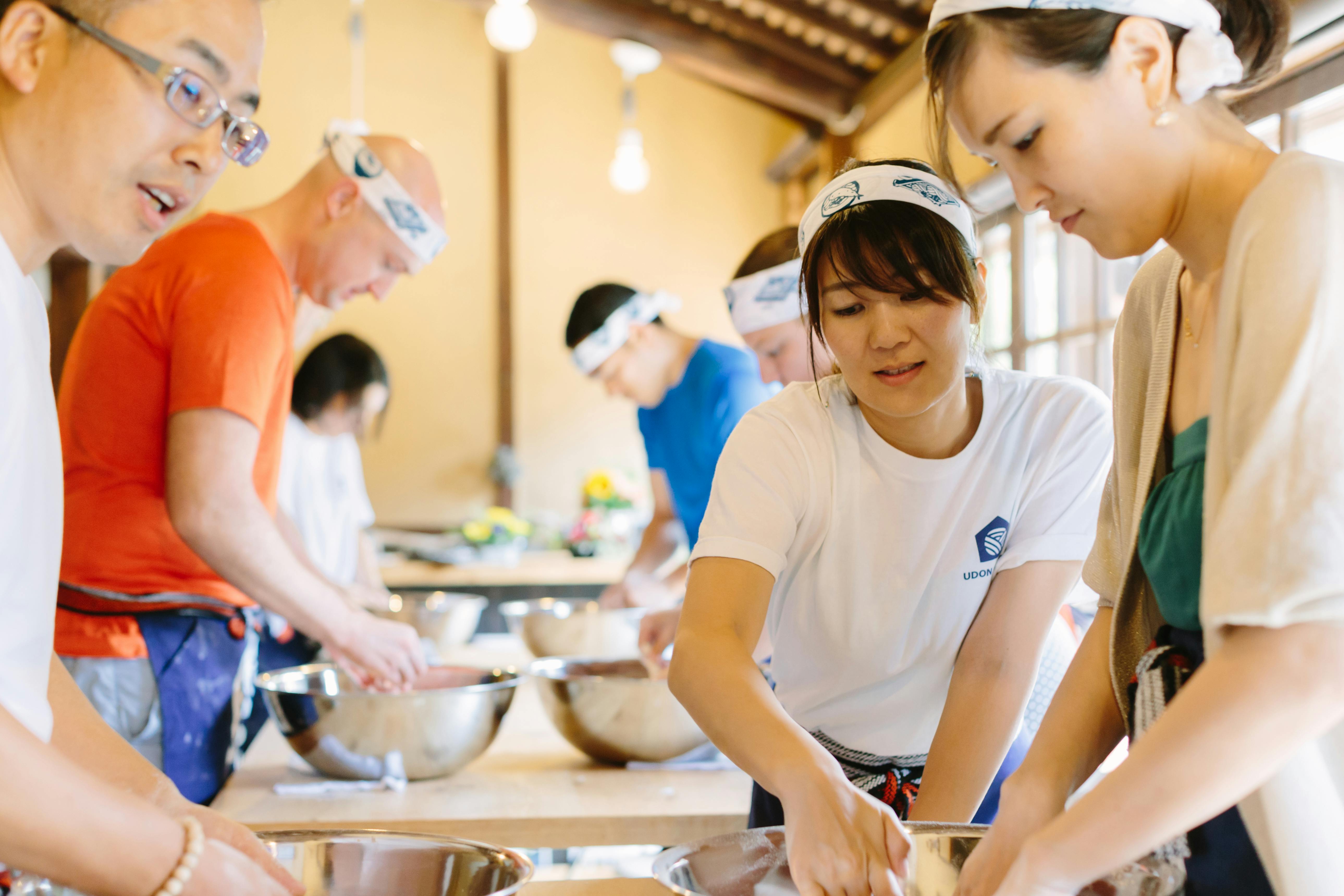 チェックインをすると麺棒を渡され、小麦粉を練ってうどんを作り、生地を寝かせている間には、讃岐うどんの歴史や文化、お出汁の勉強、また近隣の農家さんへ旬の野菜を収穫しに行ったりなど、讃岐うどんを五感をフルに使って体験する約6時間のプログラムを行っています。