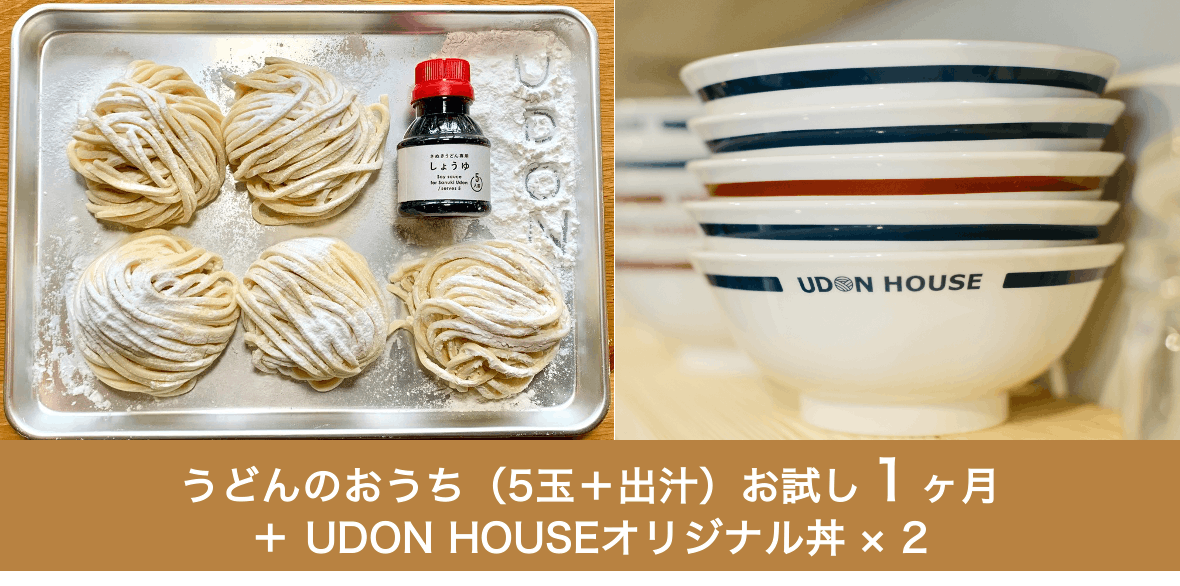 「うどんのおうち」1ヶ月分とUDON HOUSEのオリジナル丼(紺)×2がセットになったプランです。