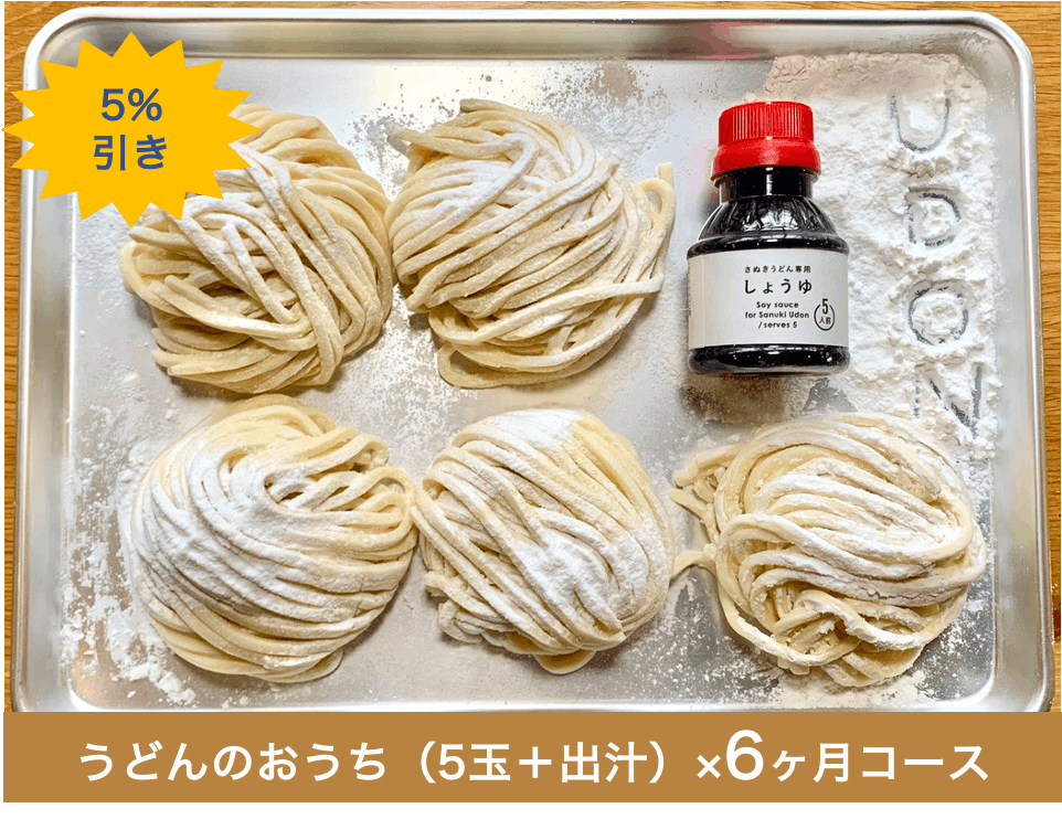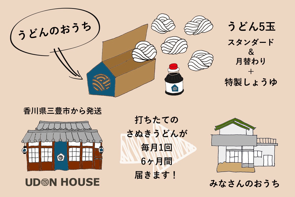 『うどんのおうち』は、讃岐うどんの文化を丸ごとお届けする、麺5玉(スタンダード+月替り)とお出汁のセットが毎月ご自宅に届くサービスです。
