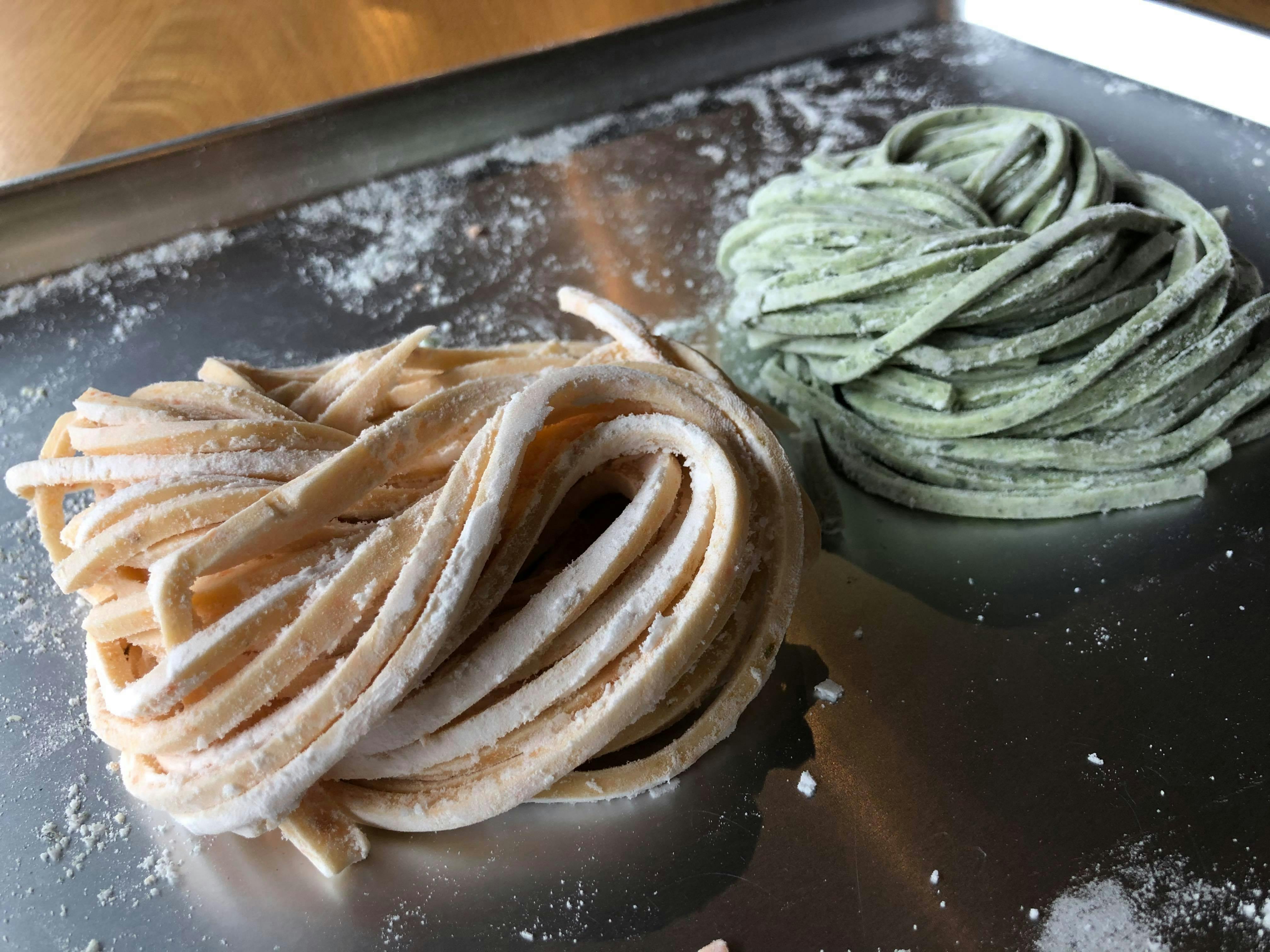 ↑わかめとにんじんを練り込んだ生地の試作